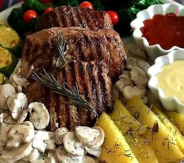 پخت استیک: درزمان پخت نان، استیک ها را با یک حوله تمیز خشک کنید و با نمک و فلفل مزه دار کنید. 1 قاشق سوپخوری روغن زیتون کف تابه بریزید و روی حرارت نسبتاً زیاد قرار دهید تا داغ شود. استیک ها را داخل تابه قرار دهید و هر طرف آنها را به مدت 3 تا 5 دقیقه سرخ کنید تا به حد دلخواه شما سرخ شود. سپس گوشت ها را به مدت 5 دقیقه در ظرف سرو قرار دهید تا استراحت کند.