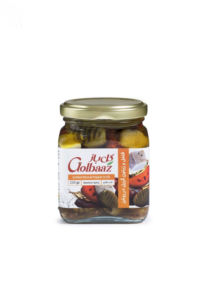 مخلوطی از زیتون گریل و فلفل گریل و پنیر و گوجه ساندراید مزه دار شده با سیر و ادویه داخل روغن